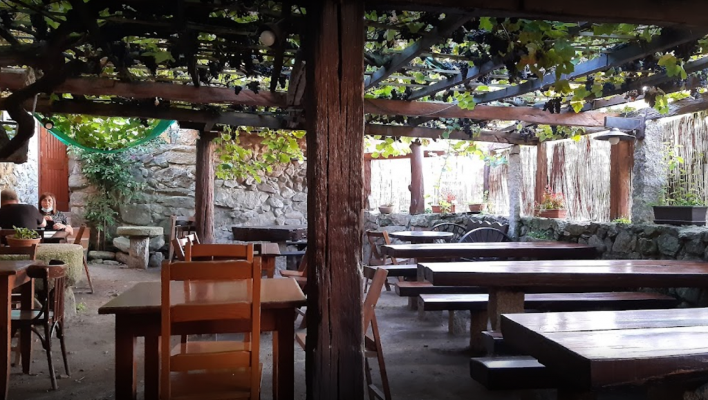 Furancho a de Marcos, tapas y recetas gallegas de pescado y marisco en un restaurante entre viñedos, con una terraza cubierta de parras.
